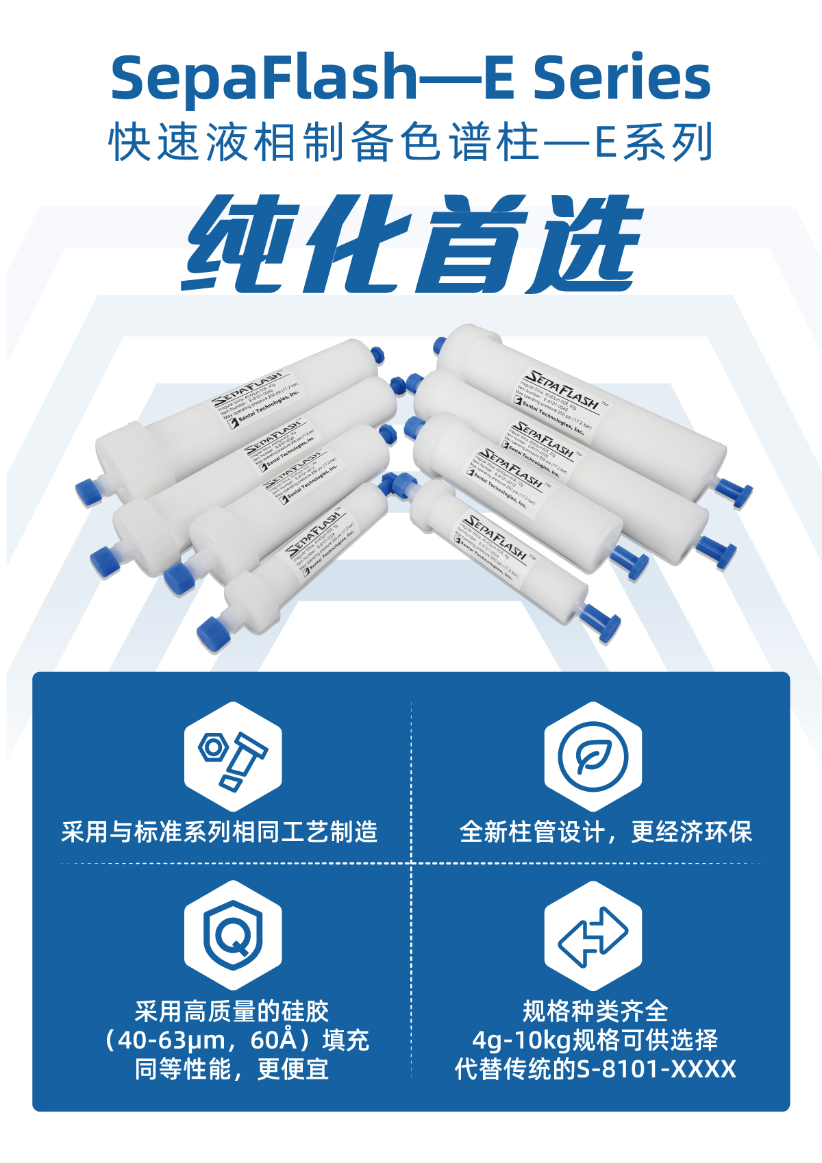 E系列分离柱采用与标准系列相同工艺制造;全新柱管设计,更经济环保;采用高质量的硅胶(40-63µm,60Å)填充,同等性能,更便宜;规格种类齐全,4g-10kg规格可供选择,代替传统的S-8101-XXXX;纯化首选。