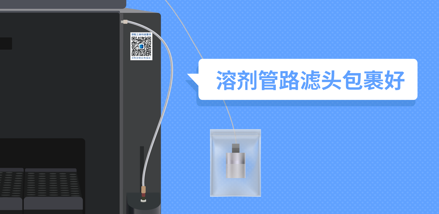 清洁机器外壳,用自封袋或锡箔纸包裹溶剂过滤头。若条件允许,使用保护罩将仪器覆盖。