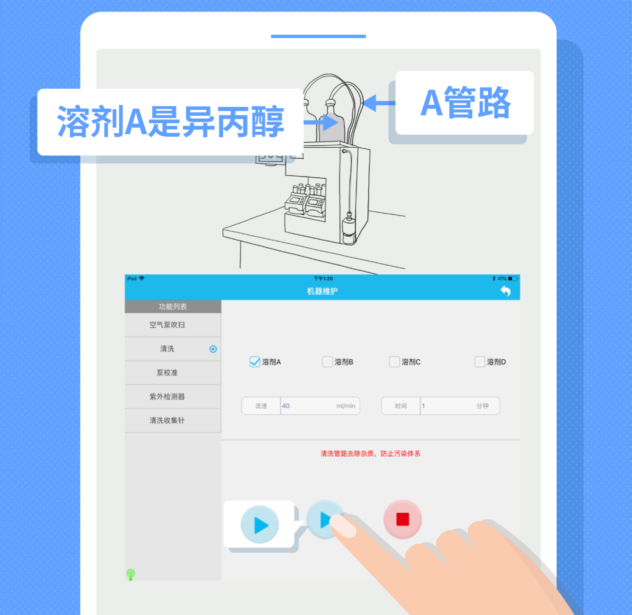取下色谱柱。下压自动柱架,将进液管路分别浸在异丙醇或者乙醇体系中,切换至仪器维护界面,分别点击A、B、C、D管路清洗,各运行3分钟,若流动相中含有盐,先用纯水过渡后再置换到异丙醇或者乙醇体系。
