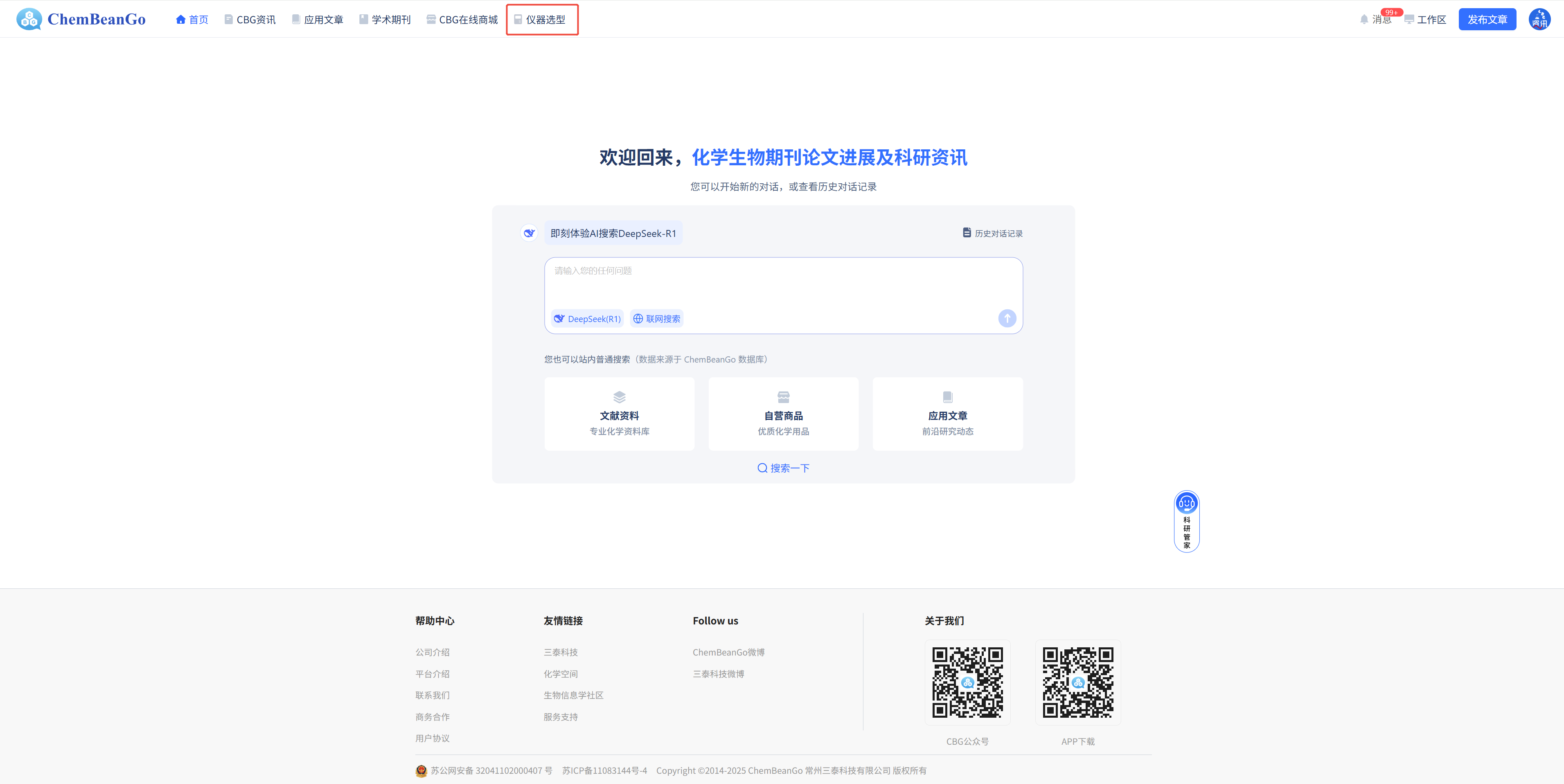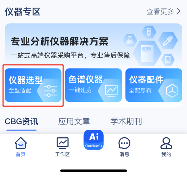 PC/APP/公众号多渠道覆盖,随时随地完成仪器配置。PC端入口:ChemBeanGo首页(https://www.chembeango.cn/)→顶部导航「仪器选型」。