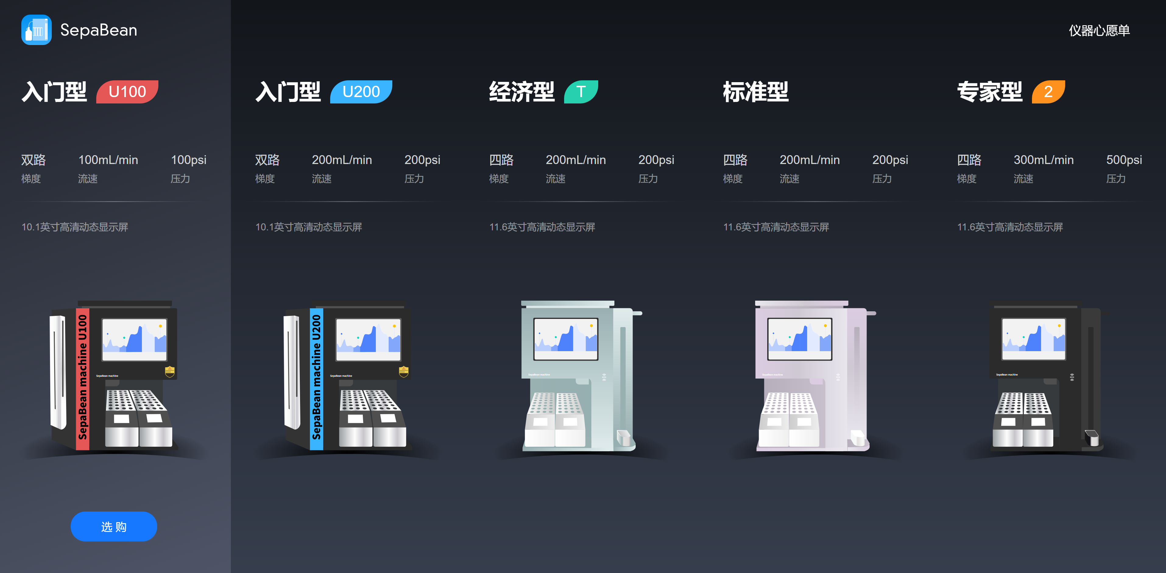 Step 1:通过官网/APP/公众号,进入选型页面,点击机型下的「选购」进入仪器的功能选配页面。