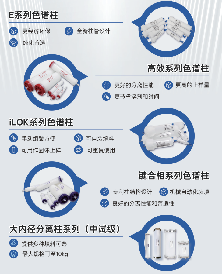 从iLok空柱(手动组装方便,可自装填料)到E系列色谱柱(经济环保,纯化首选),到高效系列色谱柱(更高上样量,更好的分离性能),再到键合相系列色谱柱,每款耗材都经过上千次实验打磨,让你节后开机即刻高效运转。
