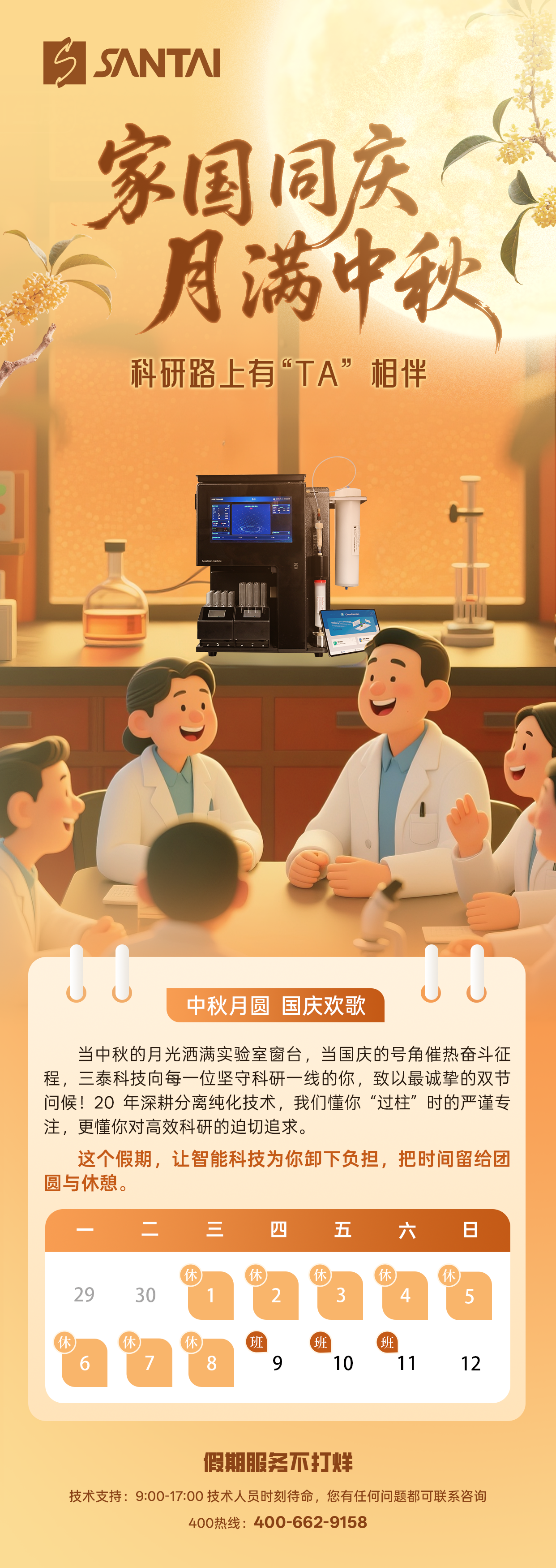 当中秋的月光洒满实验室窗台,当国庆的号角催热奋斗征程,三泰科技向每一位坚守科研一线的你,致以最诚挚的双节问候!20 年深耕分离纯化技术,我们懂你 “过柱” 时的严谨专注,更懂你对高效科研的迫切追求 —— 这个假期,让智能科技为你卸下负担,把时间留给团圆与休憩。